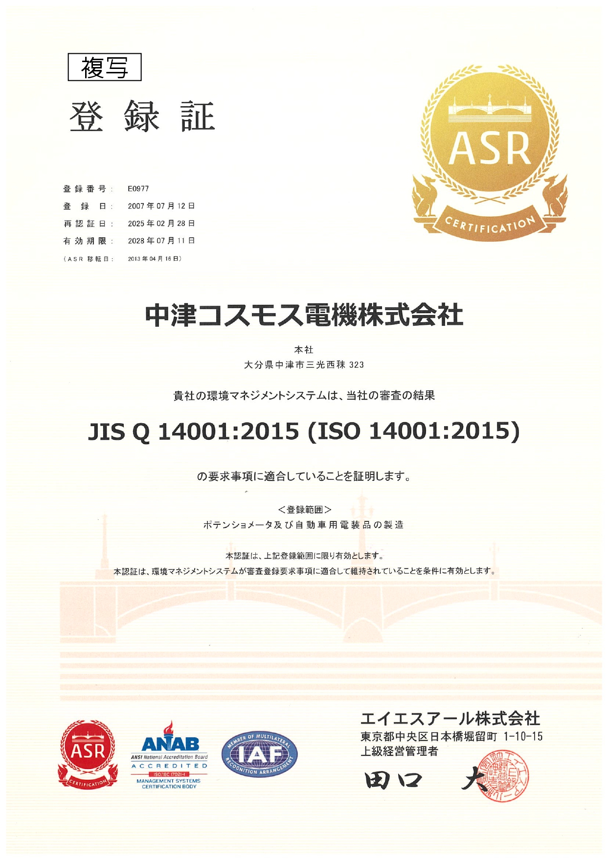 ISO14001 certified sinse Jul. 12, 2007.