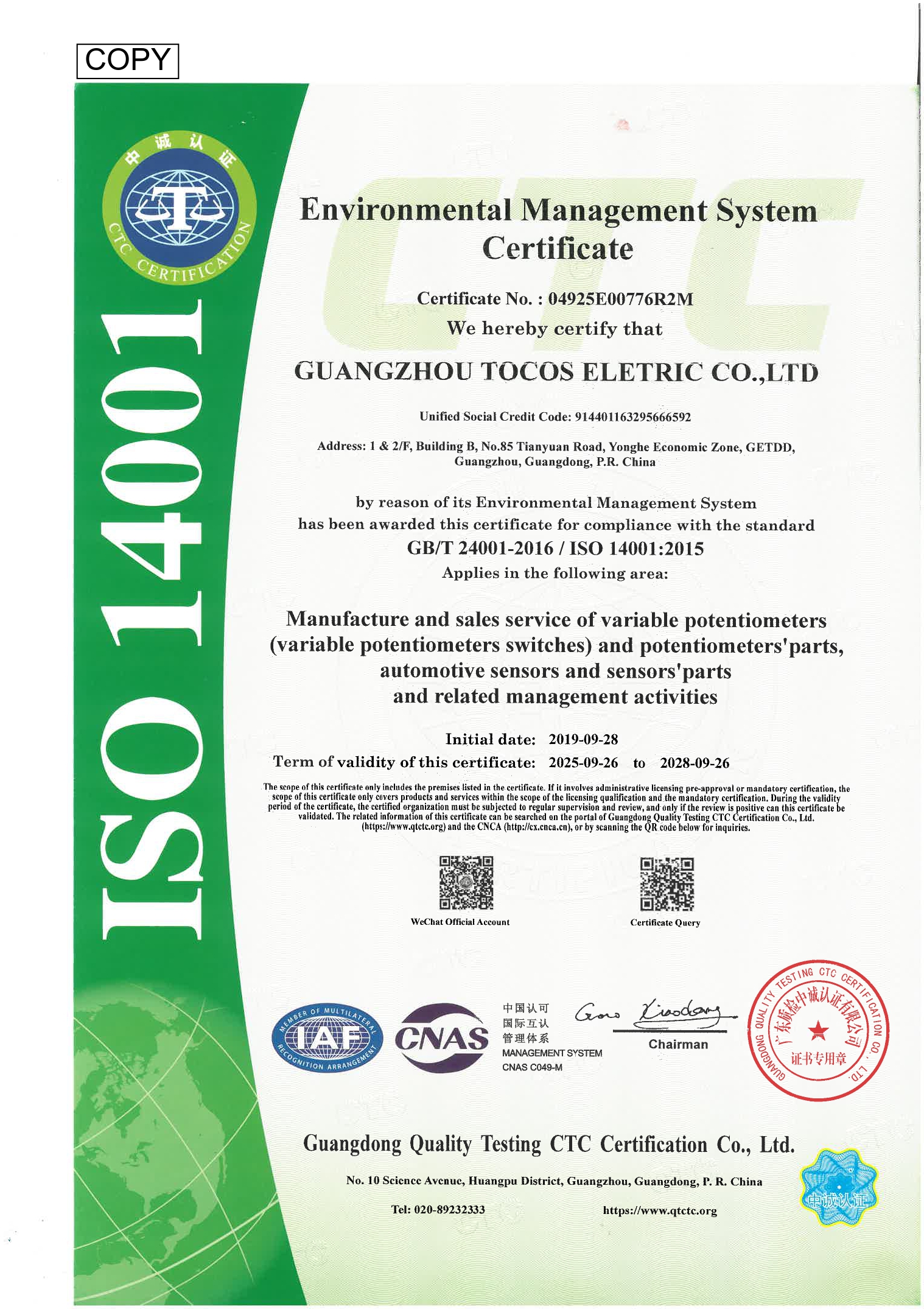 ISO14001 certified sinse Sep. 28, 2019.