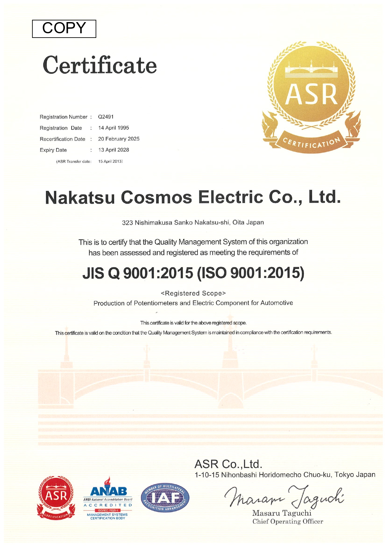 NakatsuISO9001 certified sinse Apr. 14, 1995.