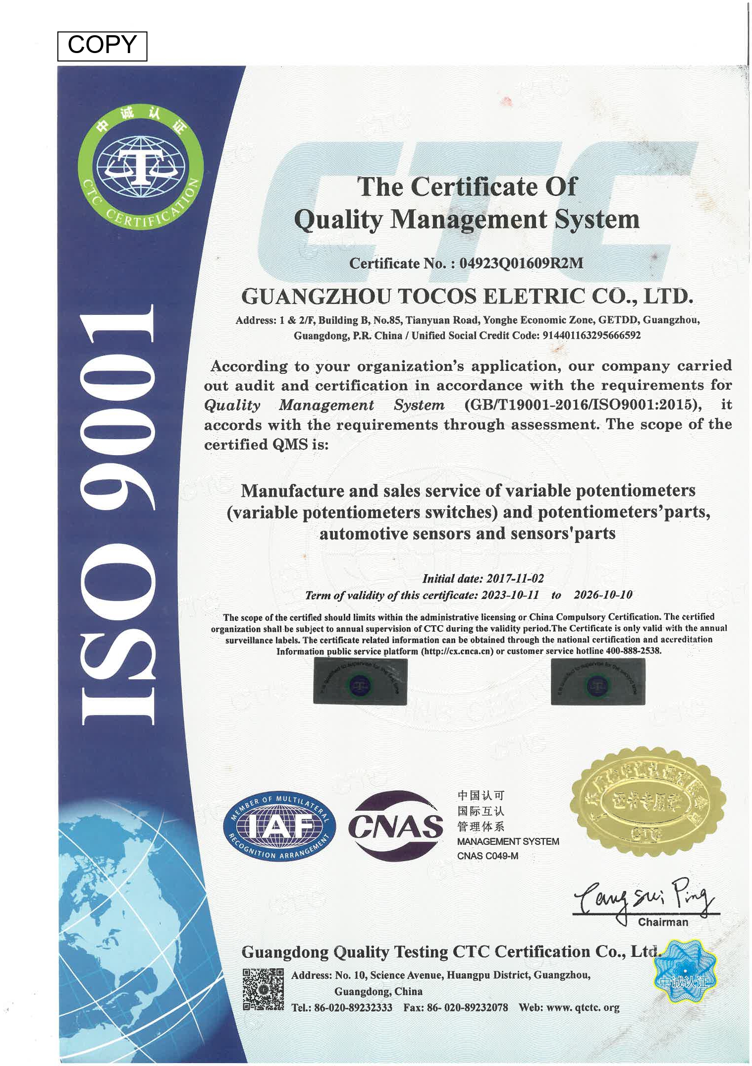 GuangzhouISO9001 certified sinse Nov. 2, 2007.