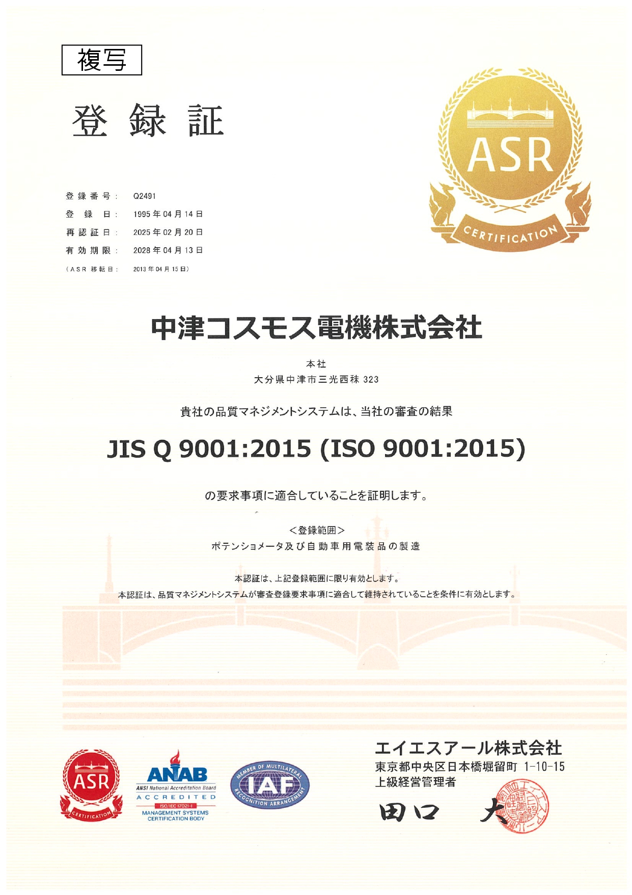 本社・白河・会津1996年2月14日にISO9001の認証を取得しました。