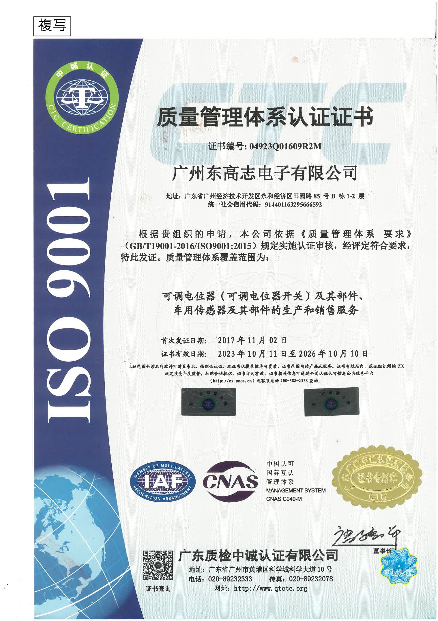 広州2007年11月2日にISO9001の認証を取得しました。